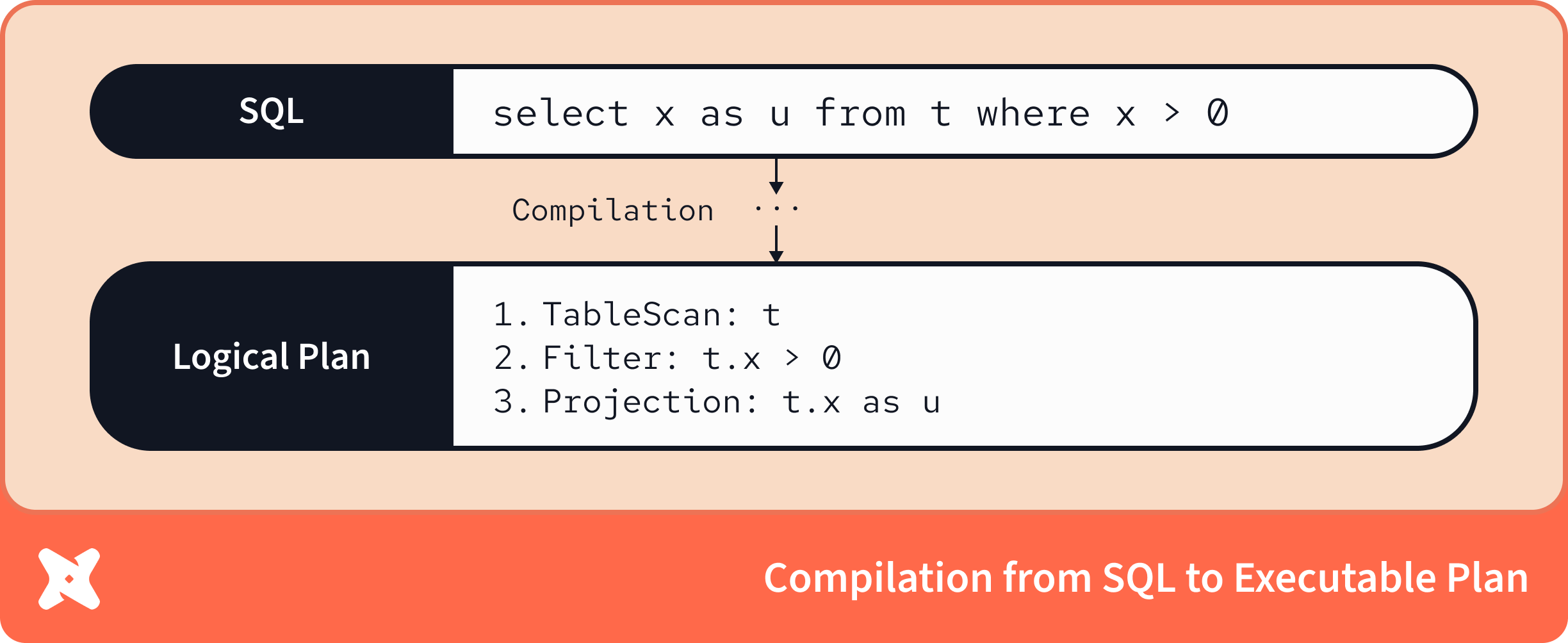 По определению, компилятор даёт гораздо более глубокое понимание поведения запроса, чем один лишь parser. Теперь мы можем проследить потоки данных и операции, которые абстрактно описывали в SQL. Компилятор поэтапно обогащает своё понимание исходной SQL‑строки и в итоге формирует логический план, обеспечивающий статический анализ и валидацию SQL‑логики.