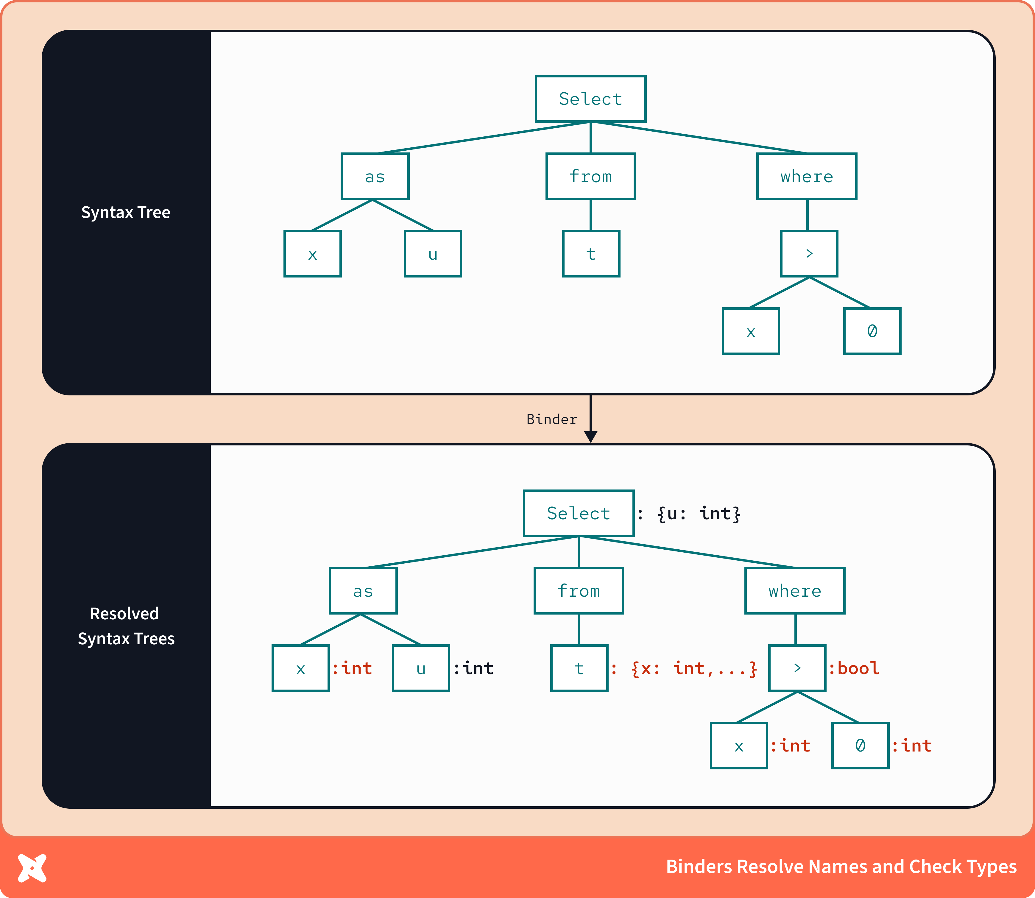 В случае SQL binders значительная часть работы заключается в добавлении информации о схеме хранилища, такой как типы данных столбцов, и сопоставлении её с сигнатурами операторов хранилища, описанными в синтаксическом дерево. Это даёт полную осведомлённость о типах. Одно дело — распознать функцию substring в запросе; совсем другое — понимать, что substring обязательно работает со строками, всегда возвращает строку и завершится ошибкой, если передать ей целое число.