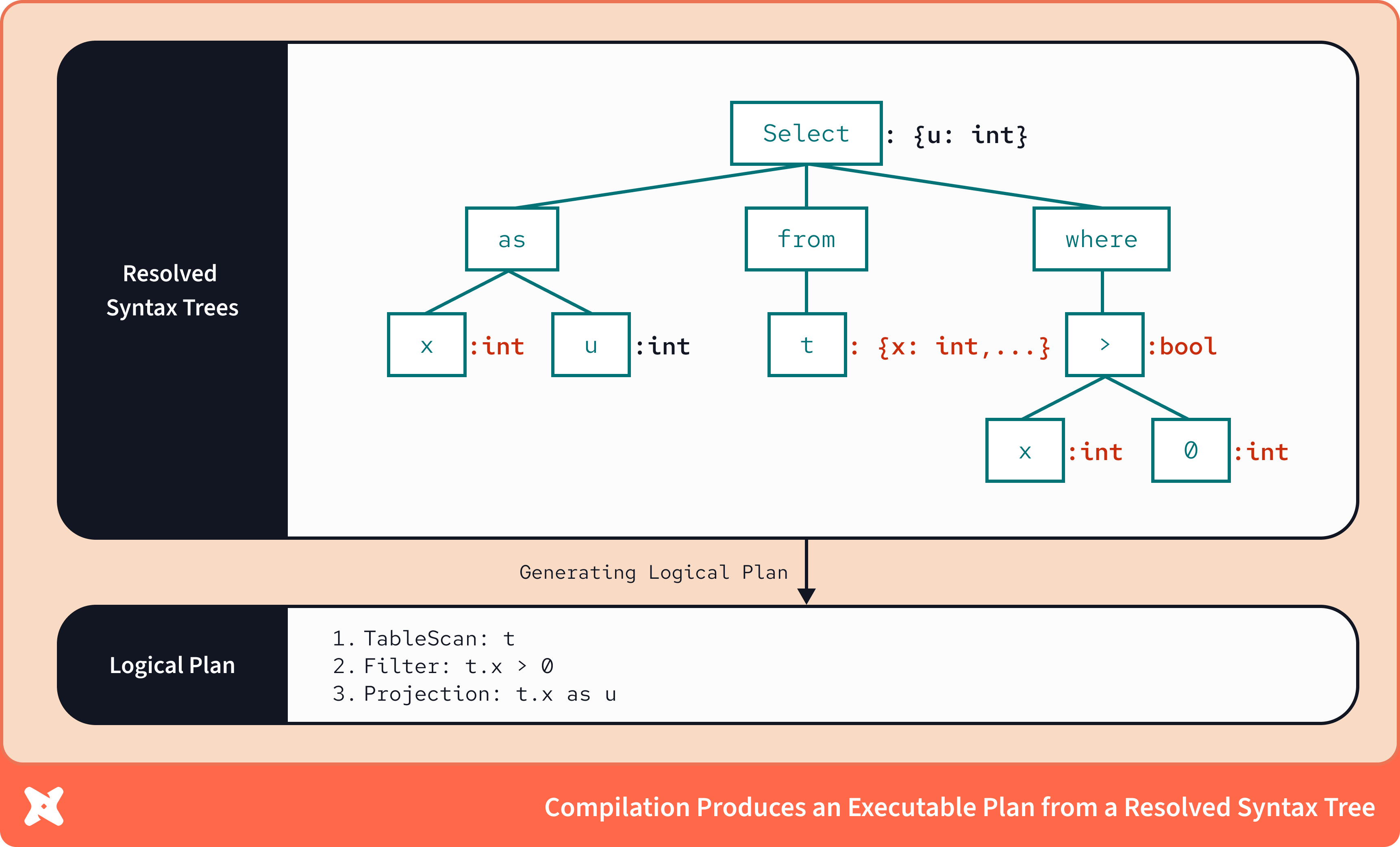 По определению, компилятор даёт гораздо более глубокое понимание поведения запроса, чем один лишь parser. Теперь мы можем проследить потоки данных и операции, которые абстрактно описывали в SQL. Компилятор поэтапно обогащает своё понимание исходной SQL‑строки и в итоге формирует логический план, обеспечивающий статический анализ и валидацию SQL‑логики.